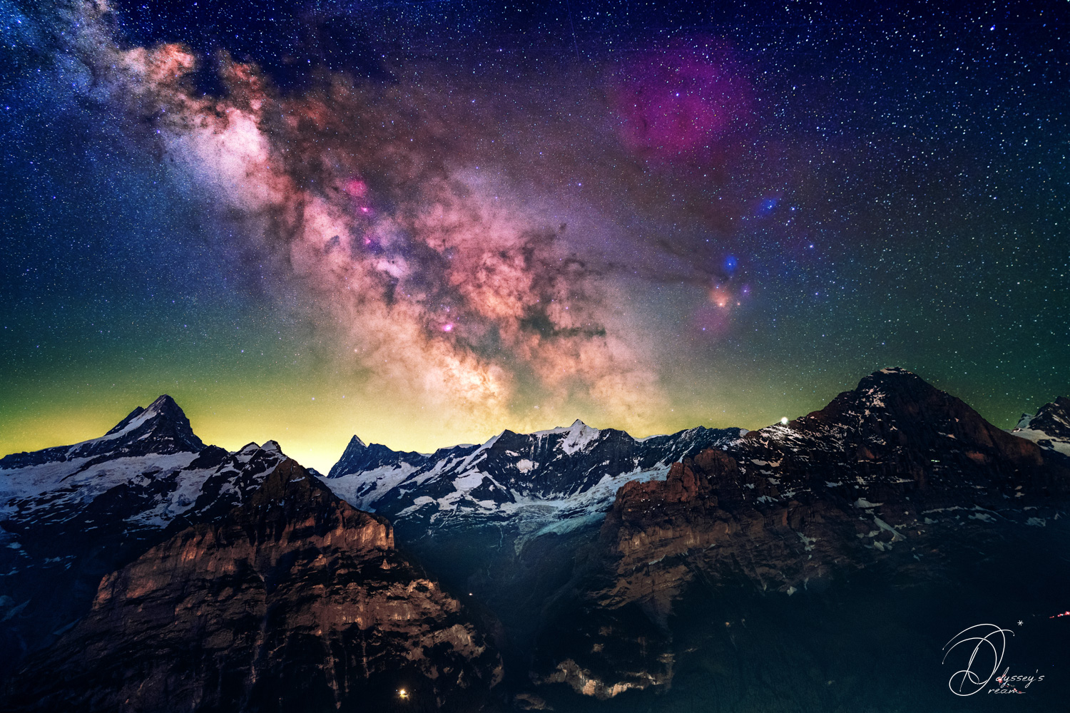 Le Schreckhorn (4078m), le Finsteraarhorn (4274m), le Grosses Fiescherhorn (4048m), l’Eiger (3970m) et le Glacier d’Ischmeer sous la Voie Lactée