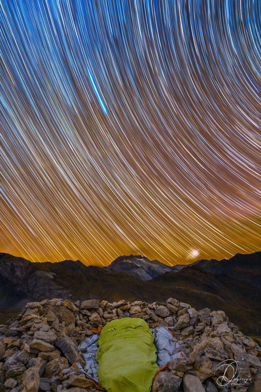 Voici où je passe alors la nuit, dans un charmant bivouac sous les étoiles. Au sein du star trail, le trait particulièrement bleu que vous voyez en haut au centre n’est autre que Vega. En bas à droite se trouve un phénomène que je ne connaissais pas et j’ai dû chercher sur internet ce que c’était. Était ce la présence d’extraterrestres? Pas cette fois… Il s’agit en fait de la réflexion du Soleil sur les Satellites Star Link. Ce phénomène ne se produit que lorsque l’observateur et le Soleil se trouve dans un angle très parculier mais est néanmoins tout à fait normal. J’ai depuis le revoir une autre fois 2 ans plus tard.