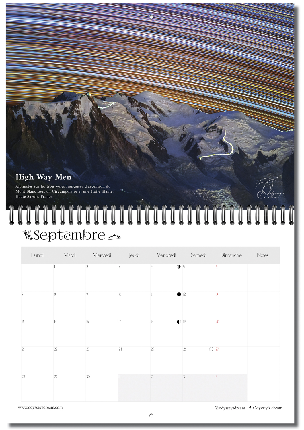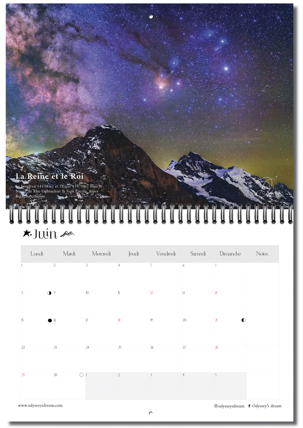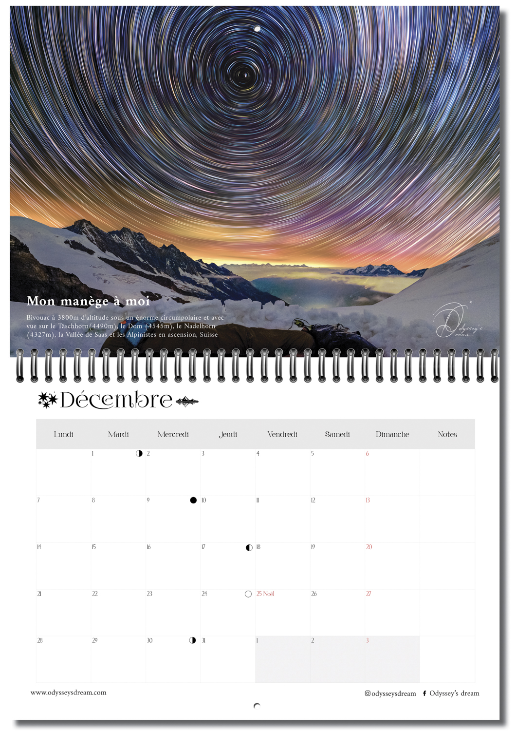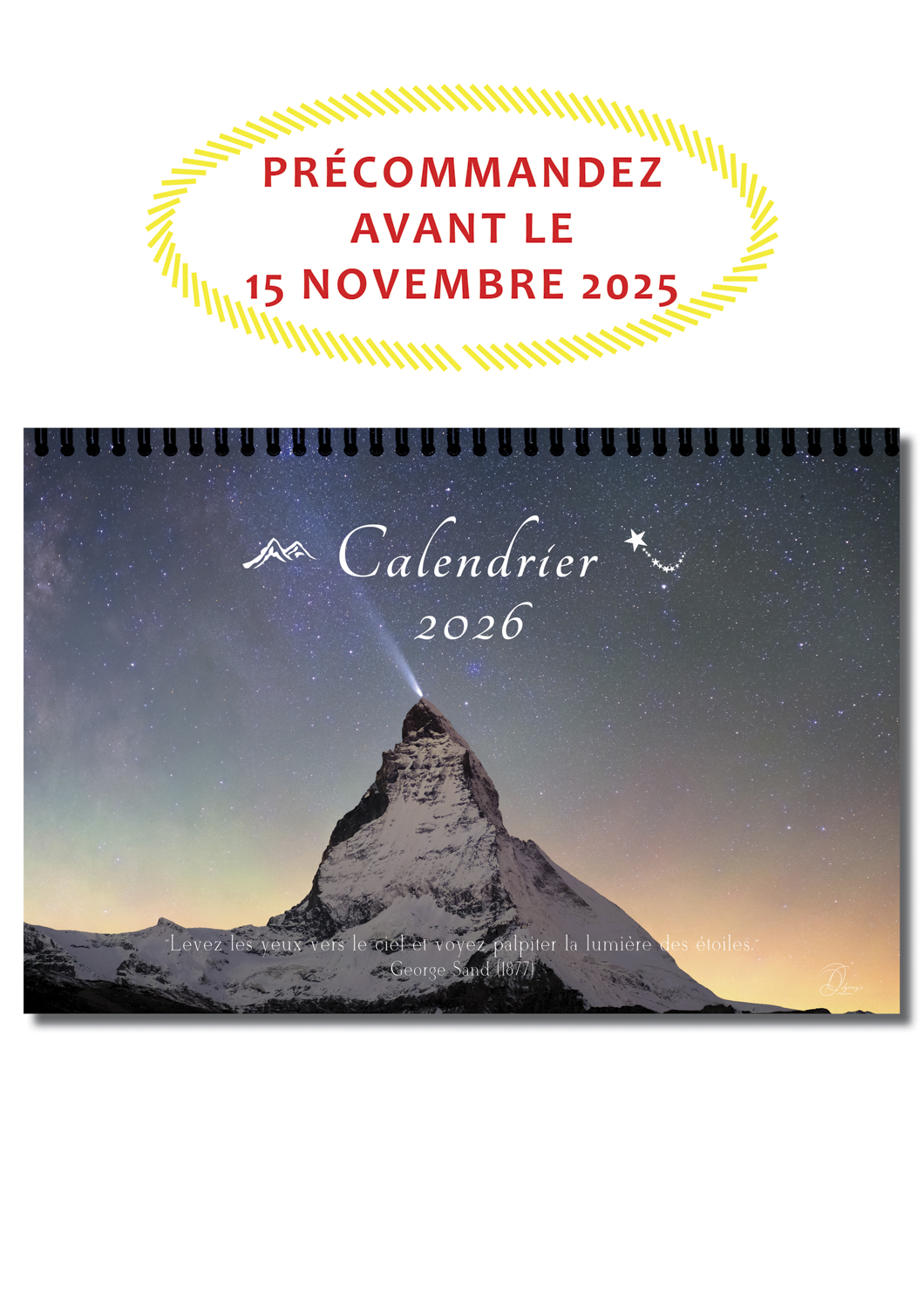Cette année, il est totalement centré sur les Alpes à l’exception d’une image de l’éclipse de Lune de Septembre 2025. J’ai choisi d’illustrer le mois d’août avec cette image étant donné qu’en août 2026 nous aurons droit à une magnifique éclipse solaire. Pour le reste, nous montons haut en altitude avec un calendrier centré sur plusieurs 4000 majeurs des Alpes.