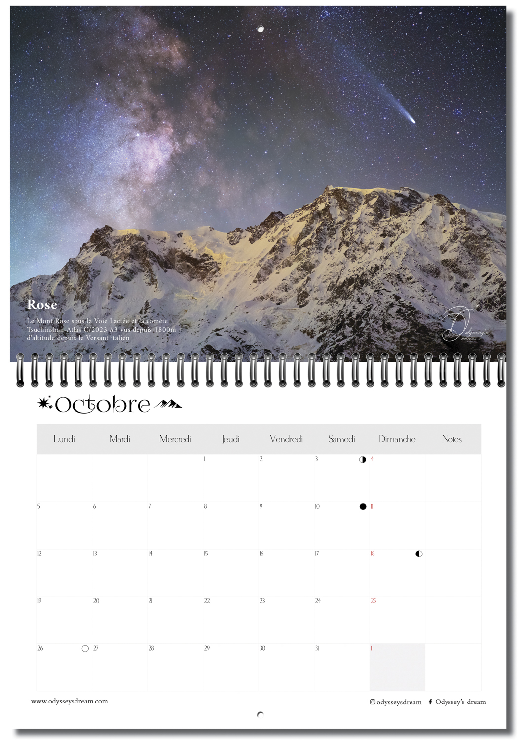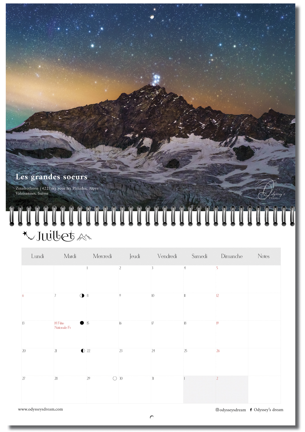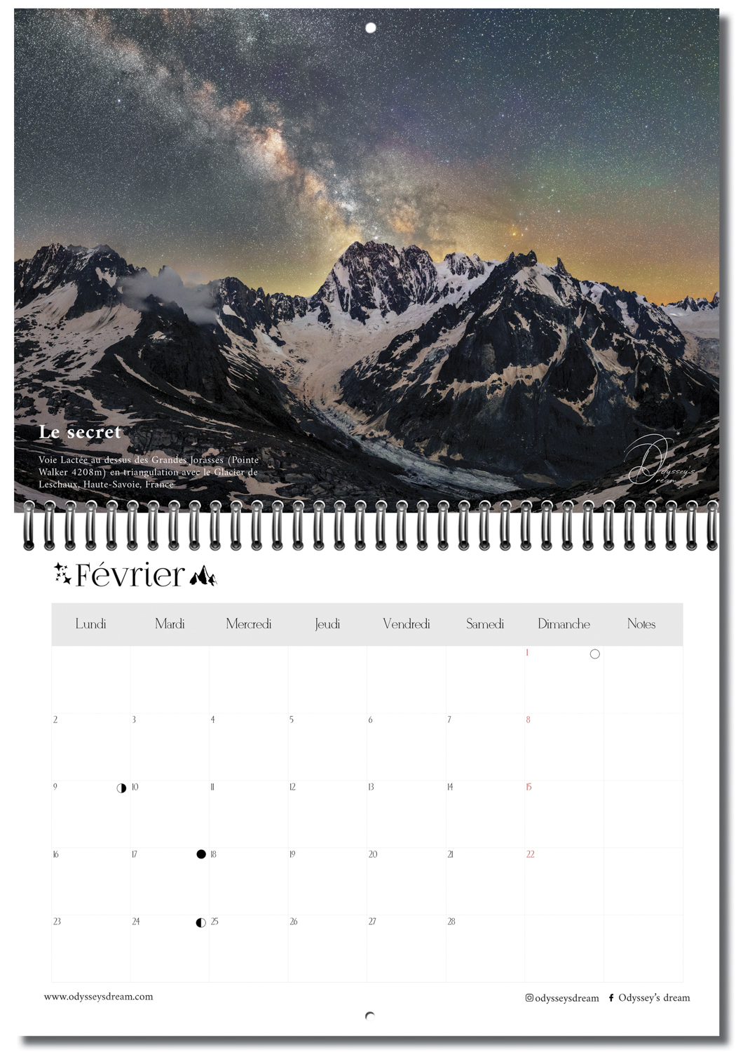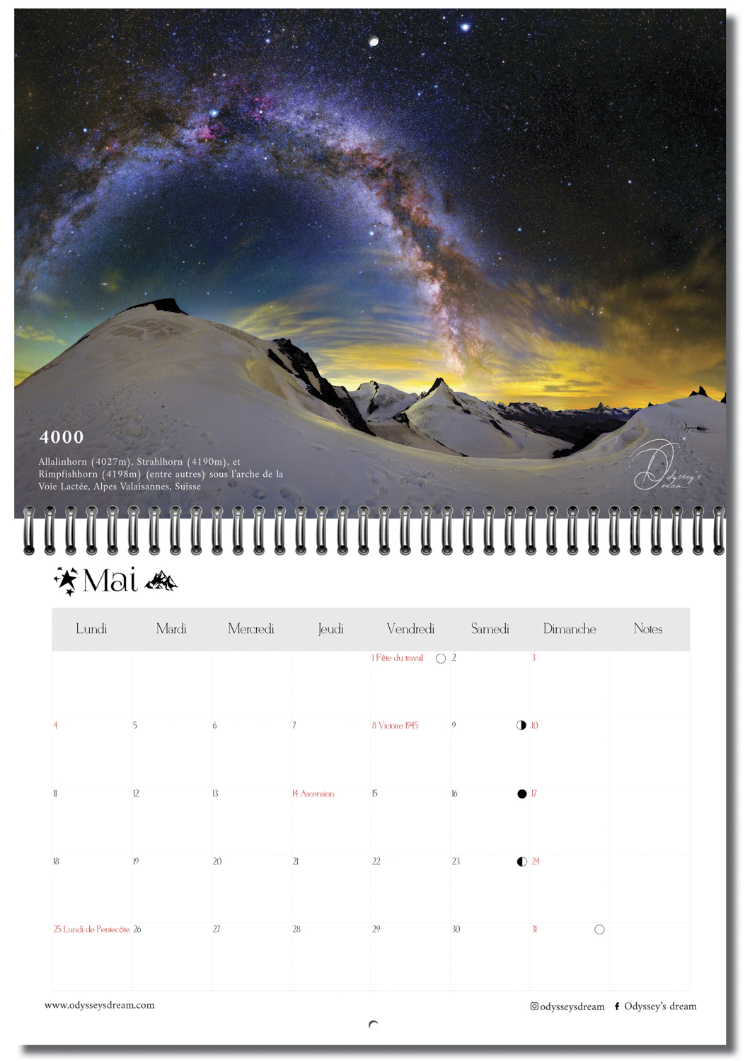 Cette année, il est totalement centré sur les Alpes à l’exception d’une image de l’éclipse de Lune de Septembre 2025. J’ai choisi d’illustrer le mois d’août avec cette image étant donné qu’en août 2026 nous aurons droit à une magnifique éclipse solaire. Pour le reste, nous montons haut en altitude avec un calendrier centré sur plusieurs 4000 majeurs des Alpes.