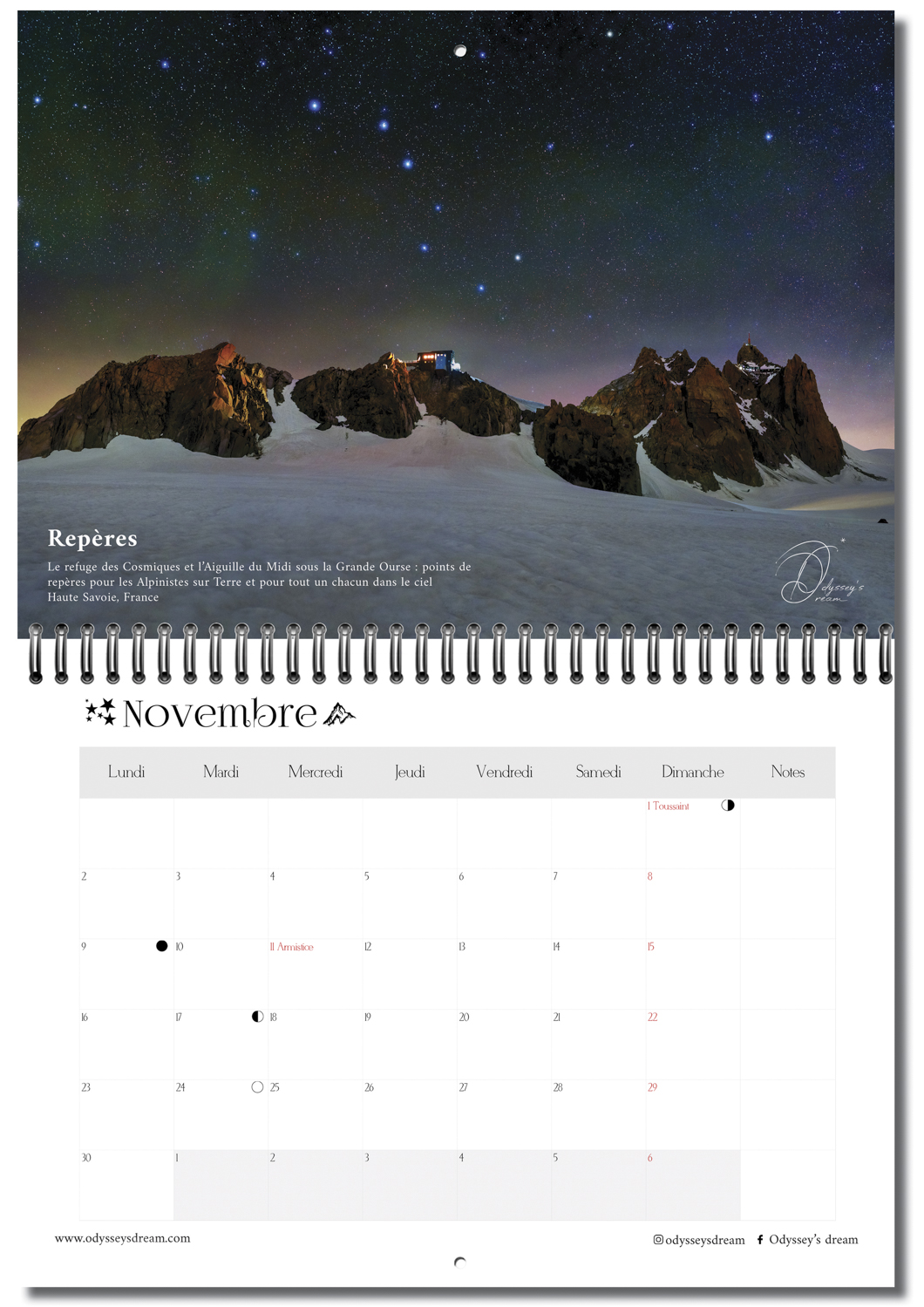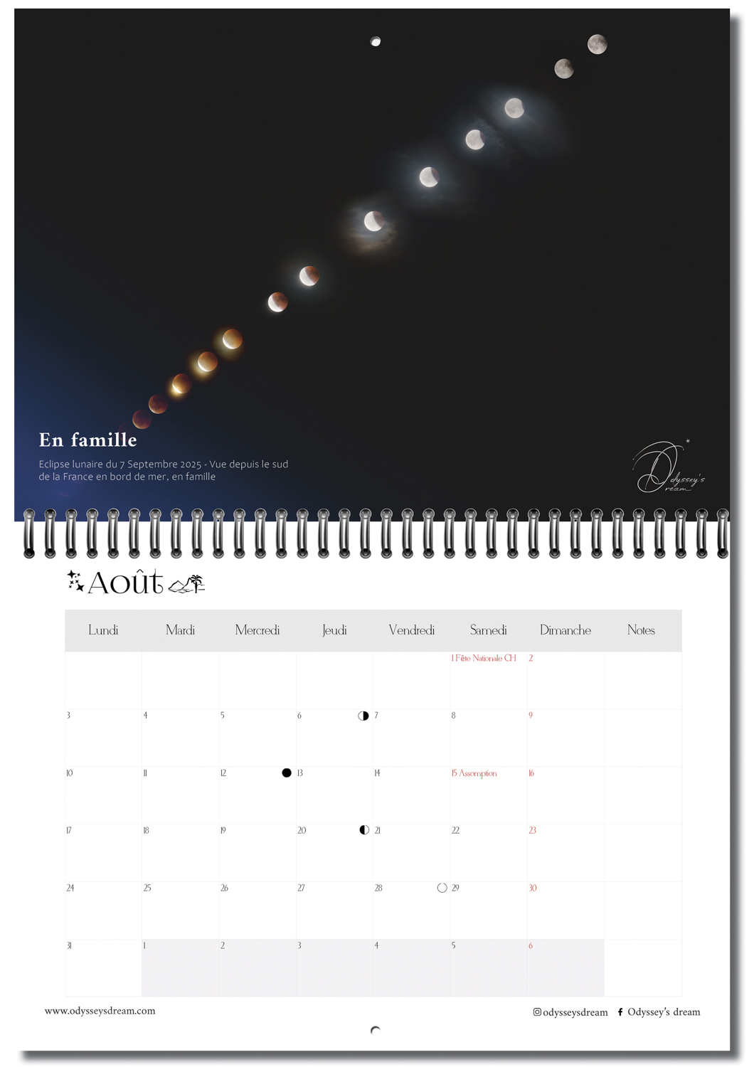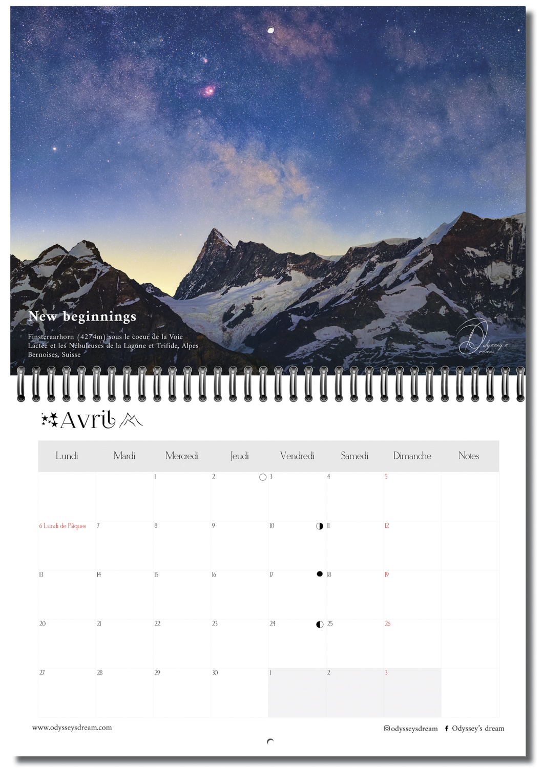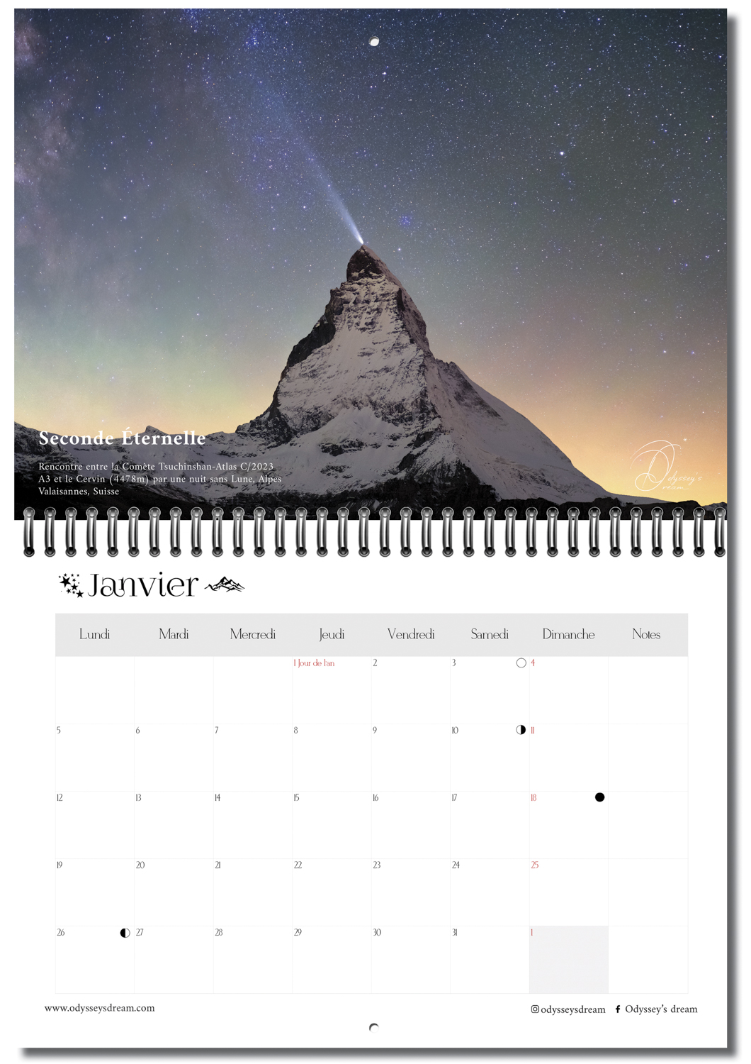 Cette année, il est totalement centré sur les Alpes à l’exception d’une image de l’éclipse de Lune de Septembre 2025. J’ai choisi d’illustrer le mois d’août avec cette image étant donné qu’en août 2026 nous aurons droit à une magnifique éclipse solaire. Pour le reste, nous montons haut en altitude avec un calendrier centré sur plusieurs 4000 majeurs des Alpes.