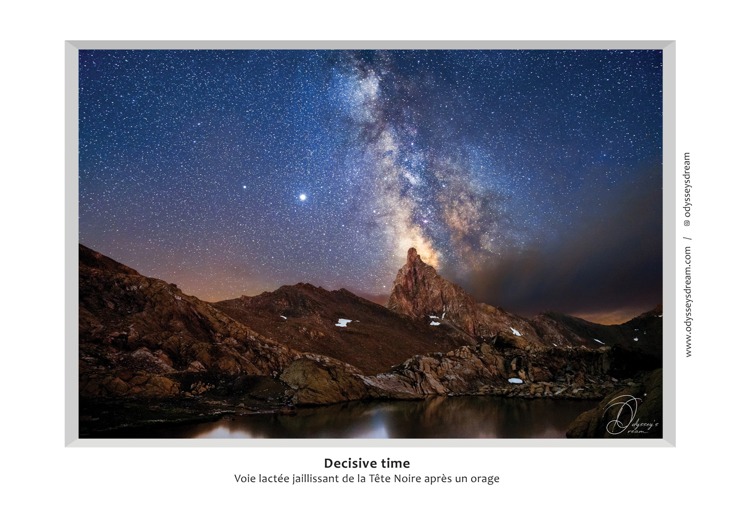 Plus tard l’orage se calme et la nuit tombe. Je ressors de ma tente à l’heure prévue pour réaliser cette image qui prend vit entre deux fils de nuages. On peut d’ailleurs constater les nuages qui sont encore présents sur la droite de l’image. Beaucoup de personnes qui ont vu cette image en exposition ont dit avoir ressenti une atmosphère forte dans celle ci. Je pense que c’est probablement l’atmosphère de l’orage qui se ressent dans cette image.