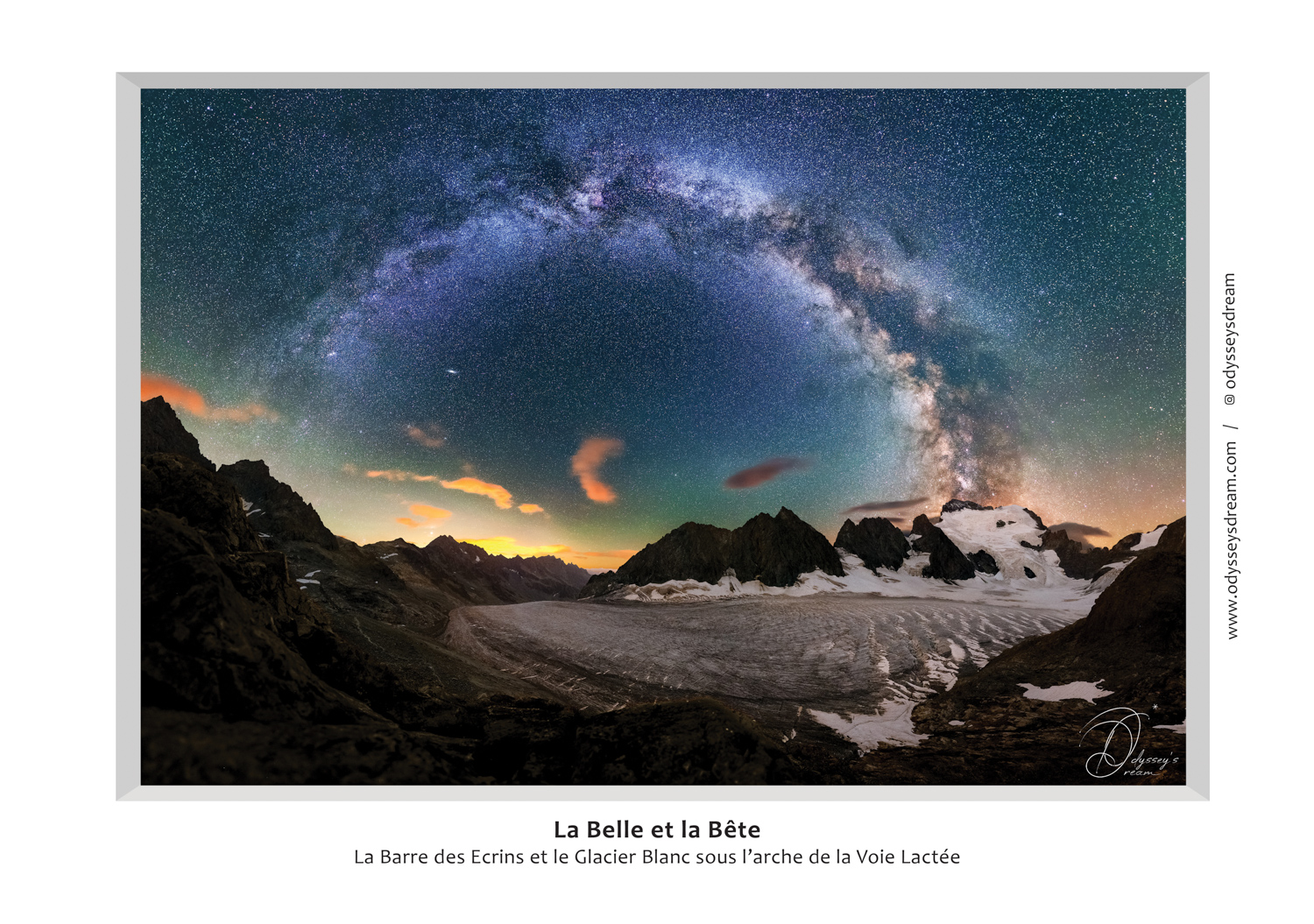 – La Belle pour la beauté de l’image elle même avec cet arche de la Voie Lactée estival haut et complet sortant de la Barre des Écrins et survolant le Glacier Blanc dans le Parc National des Écrins.