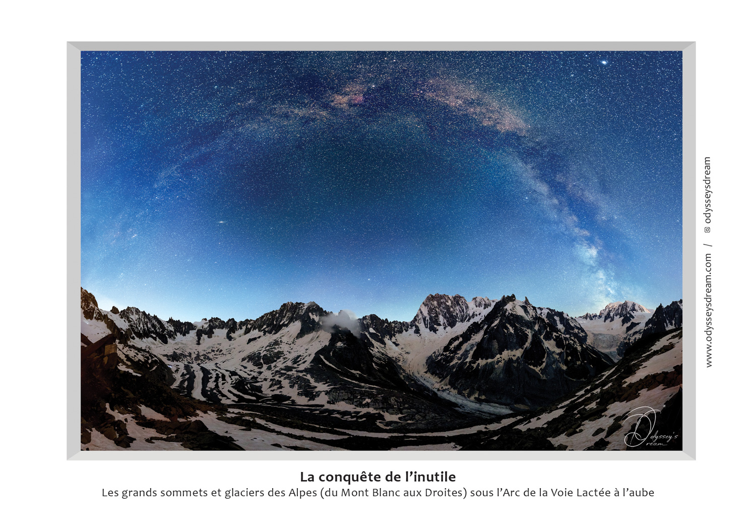 Ici nous retrouvons de grands sommets des Alpes sous l’arc de la voie lactée à l’aube. Nous avons notamment : les Droites (4000m), le Glacier du Talèfre, les Grandes Jorasses avec les Pointes Croz (4110m), Whymper (4184m), et Walker (4208m), le Glacier de Leschaux, le Mont Blanc, le Mont Blanc du Tacul, le Glacier du Géant, le Glacier du Tacul. Panorama quasiment à 360 degrés témoin de cette conquête.
