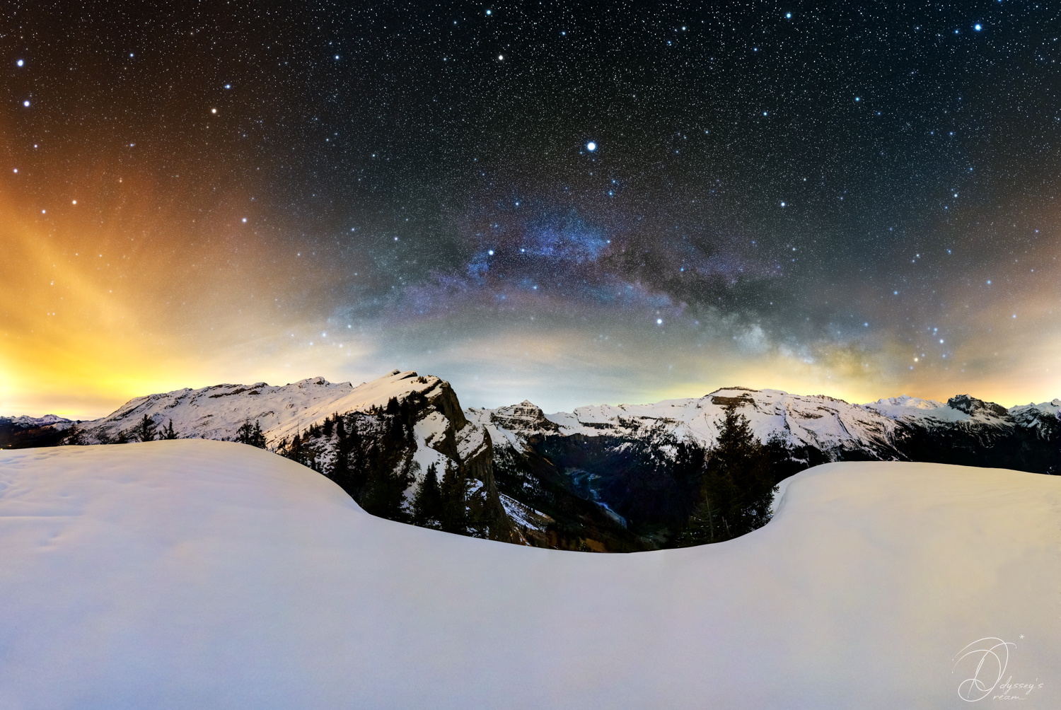 Plusieurs choses se passent sur cette image: nous avons un point de vue fort peu connu sur le très connu Cirque du Fer à Cheval en Haute Savoie et sur la Vallée du Giffre. Ce point de vue se situe au centre d’un cercle créé par l’arc de la Voie Lactée dans le ciel et l’arc d’une corniche au sol.