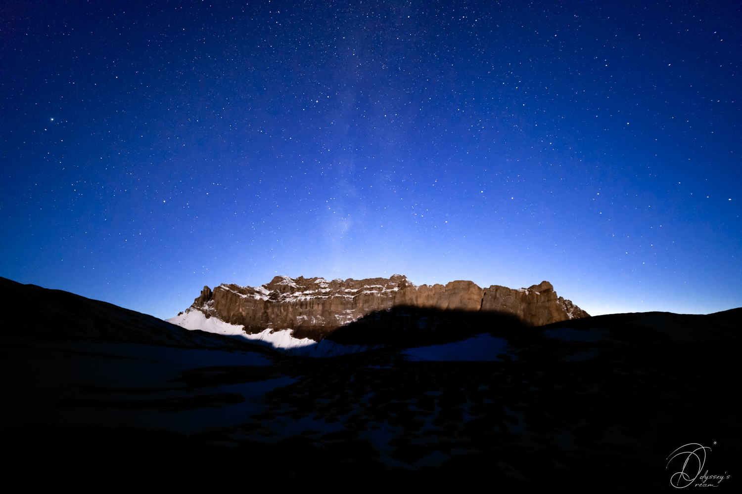 Son titre lui a été donné par une proche et représente le Double couronnement de la Chaine des Fiz par l’ombre du Mont Buet et par la Voie Lactée.
