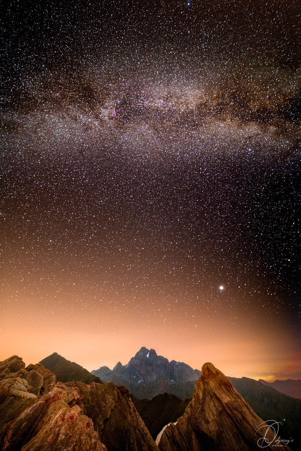 Cette nuit là au sommet du Pain de Sucre deux sujets majeures d’astrophotographie s’offrent à moi: Orienté à l’Est, l’arche de la voie lactée qui passe au dessus du Mont Viso et, orienté au Sud, le cœur de la voie lactée surplombant les montagnes des Alpes côté français et italien.