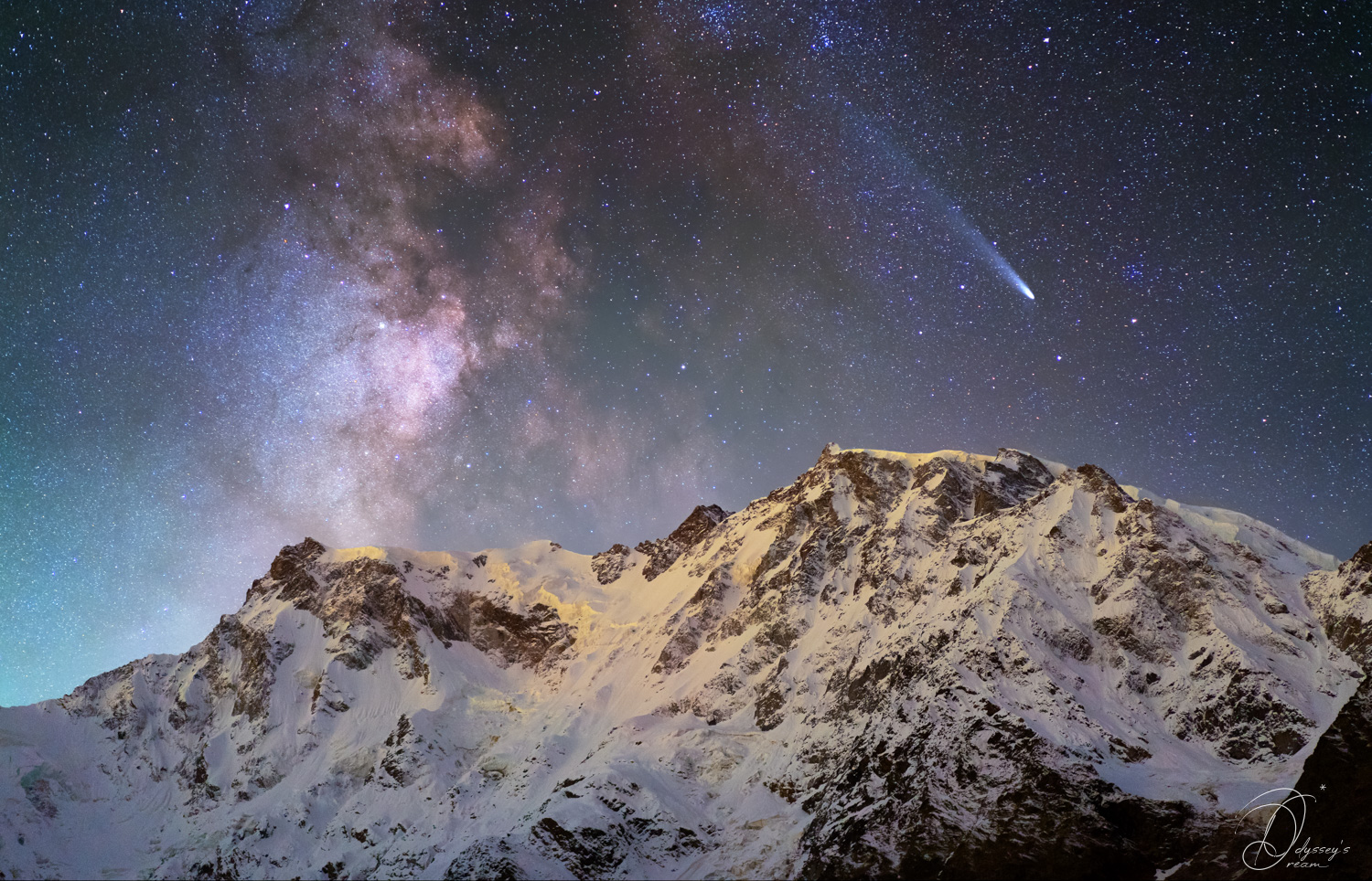 Dans la rencontre céleste que représente l’image, vous remarquerez que la montagne est rosée, comme si la Voie Lactée se reflétait dans la neige et lui offrait cette couleur. La balance des blancs de l’image est uniforme sur l’ensemble de la montagne et la partie rosée est belle et bien rosée. Ce fût pour moi une découverte intrigante lors de mon travail sur l’image de part le nom de la montagne. Les anciens avaient ils vu quelque chose? Le nom de la montagne pourrait il être en lien avec cette couleur qui m’est apparue?