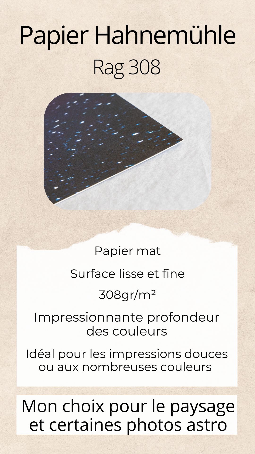 Chacun des papiers d'art est en effet unique. Il pourra être plus ou moins texturé, plus ou moins grammé (épais), mat, brillant ou baryté, etc. En fonction de ces caractéristiques, le rendu final de l'image sera plus ou moins contrastés, plus ou moins doux, plus ou moins texturés, etc.