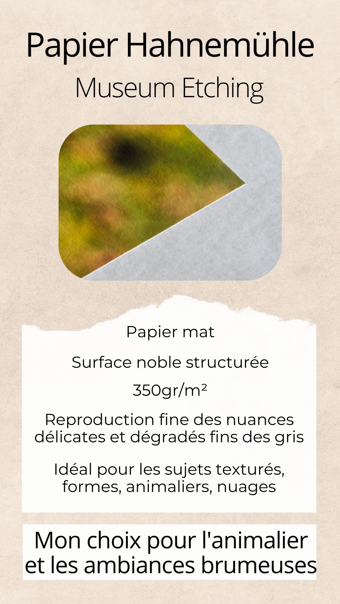Après de nombreux tests et tirages d'essai, j'ai choisi de travailler avec la gamme de papier d'art Hahnemühle. Chez ce fabriquant - qui existe depuis 1584! - j'ai sélectionné trois papiers pour vos tirages d'art en fonction de leur caractéristiques et de leur rendu pour les œuvres que je vous propose.